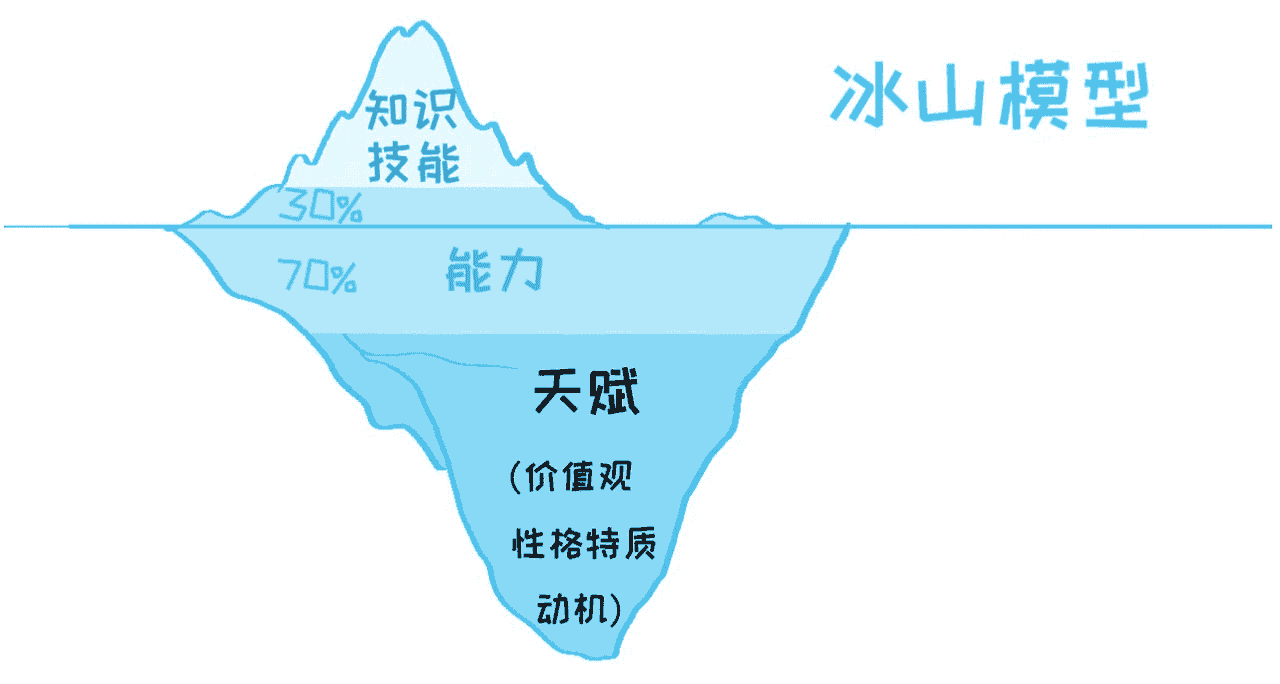 我们之前提到的冰山模型有很多研究表明冰山下面的天赋部分60%以上的程度决定了一个人能够创造的价值
