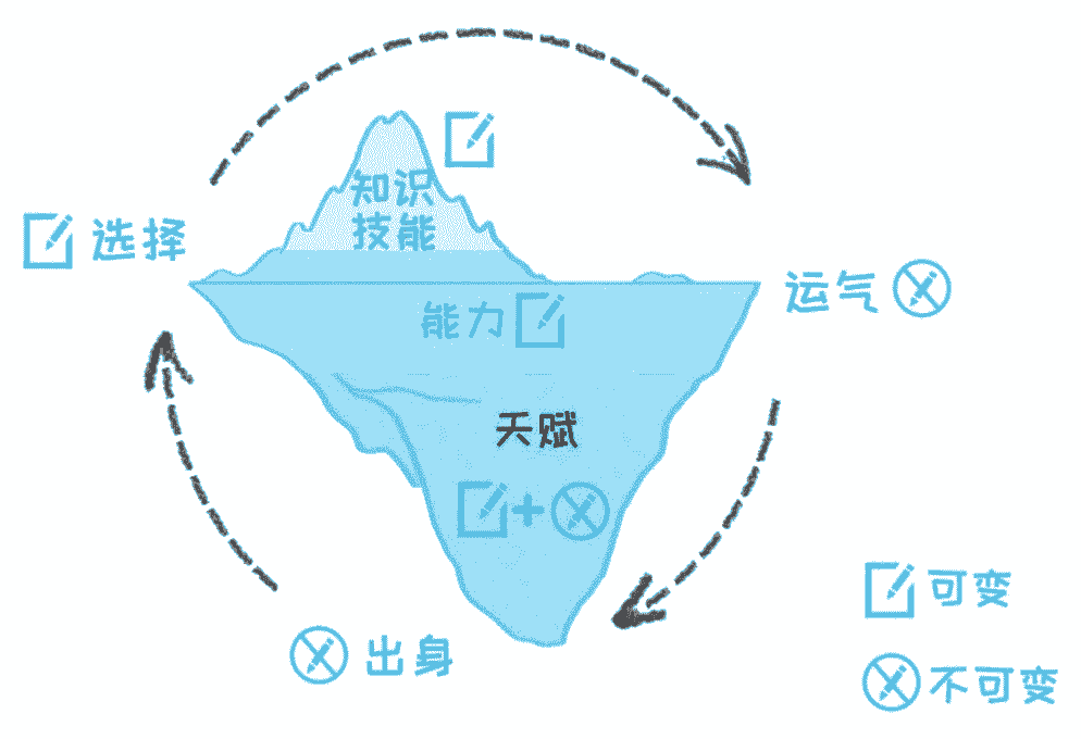 复杂一点的是天赋和选择。天赋本身几乎不能改变,但是你可以通过挖掘自己的天赋,选择与之匹配的工作。从而最大化地利用它。所以,我们暂且认为他是部分可变的。