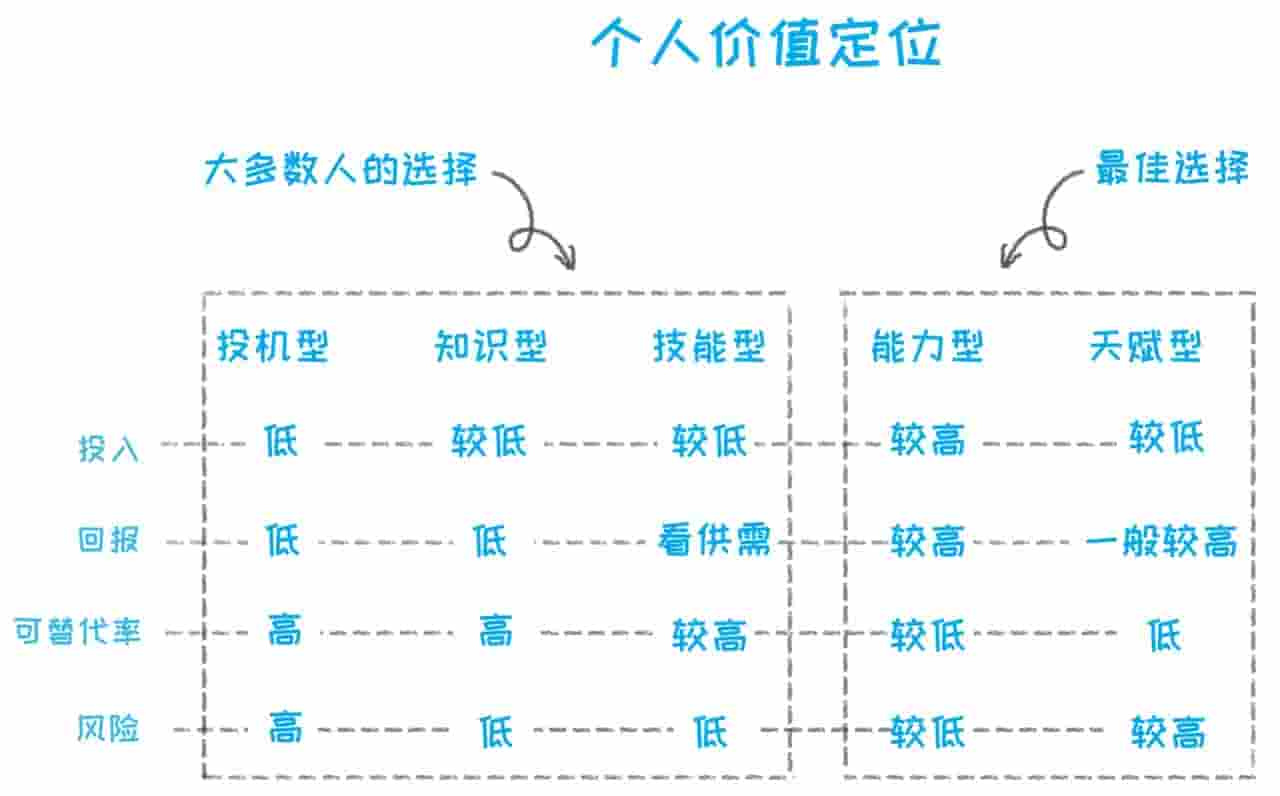 从以上这张图可以看出,想要获得更高的回报,最优的选择有两个,一个是提升能力,二是不断认识自己,发掘自己的天赋。
