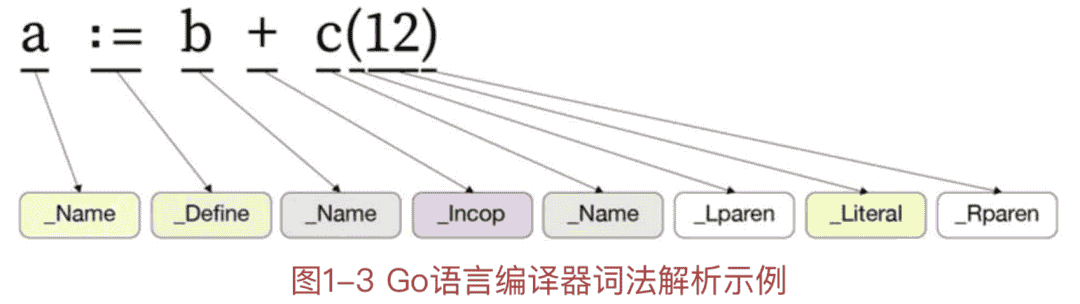 在词法解析阶段,Go语言编译器会扫描输入的Go源文件,并将其符号(token)化。例如将表达式a :=b+c(12)符号化之后的情形,如下图所示: