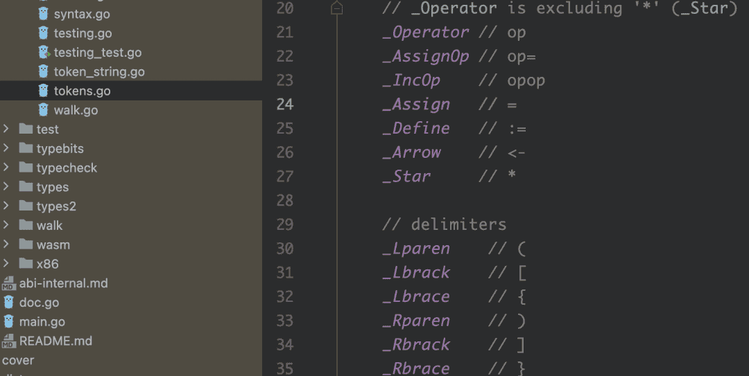 实际上,这些token就是用iota声明的整数常量,定义在syntax/tokens.go文件中。如下图: