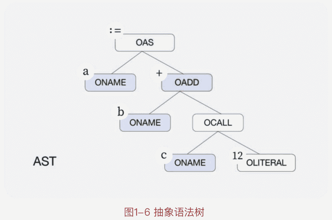 还是以a :=b+c(12)为例,该赋值语句最终会变为如图1-6所示的抽象语法树。节点之间具有从上到下的层次结构和依赖关系。