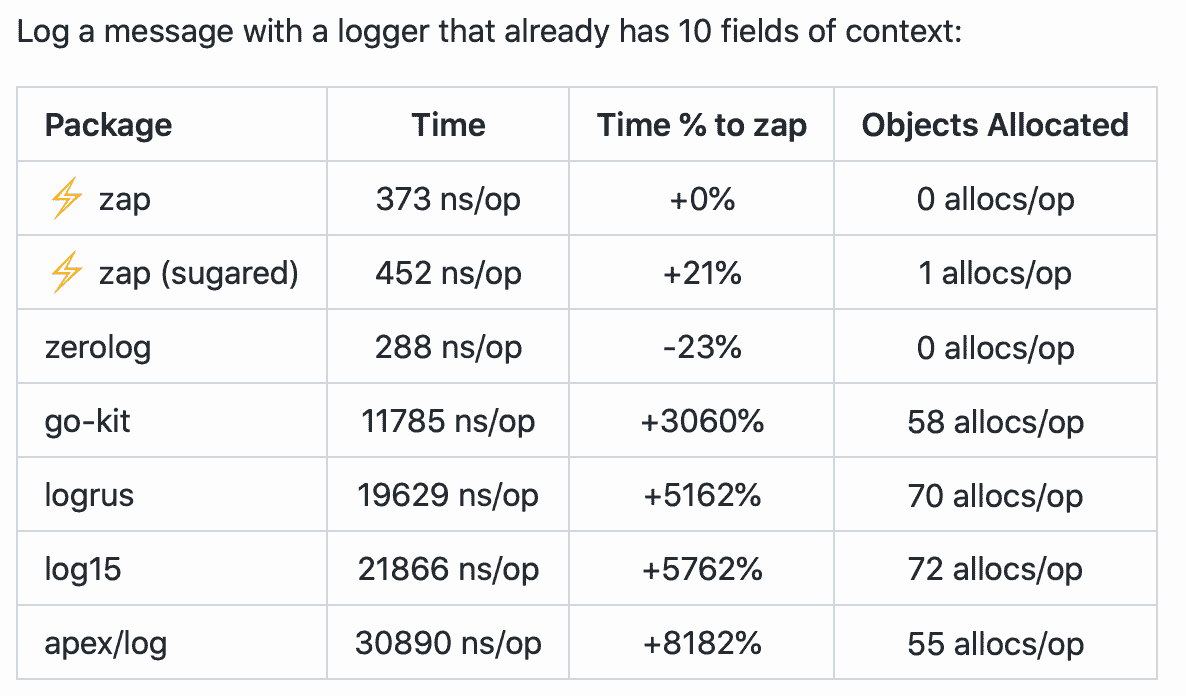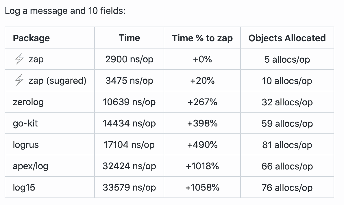 SugaredLogger : 在性能很好但不是很关键的上下文中使用,它比其他结构化日志记录包快4-10倍,并且支持结构化和printf风格的日志记录。与 log15go-kit 一样,SugaredLogger 的结构化日志 api 类型灵活,并接受可变的键值对的数量。