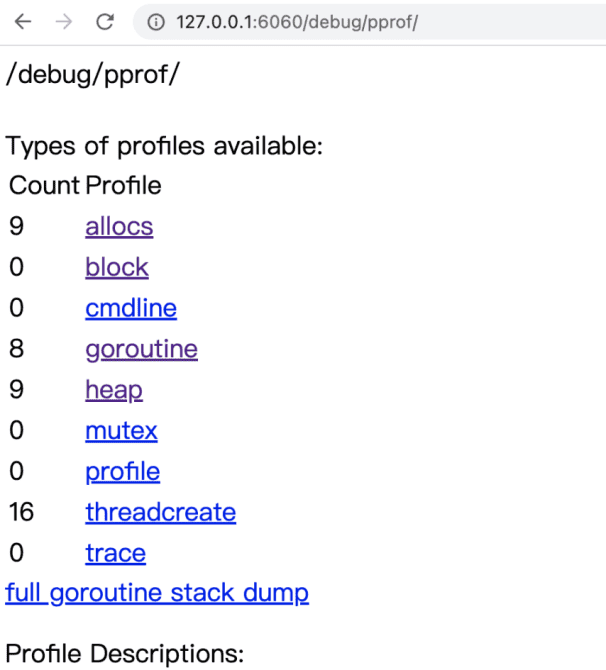 allocs:查看过去所有内存分配的样本,访问路径为/debug/pprof/allocs。block:查看导致阻塞同步的堆栈跟踪,访问路径为/debug/pprof/block。cmdline:当前程序的命令行的完整调用路径。goroutine:查看当前所有运行的 goroutines 堆栈跟踪,访问路径为/debug/pprof/goroutine。heap:查看活动对象的内存分配情况, 访问路径为/debug/pprof/heap。mutex:查看导致互斥锁的竞争持有者的堆栈跟踪,访问路径为/debug/pprof/mutex。profile:默认进行 30s 的 CPU Profiling,得到一个分析用的 profile 文件,访问路径为/debug/pprof/profile。threadcreate:查看创建新OS线程的堆栈跟踪,访问路径为/debug/pprof/threadcreate。