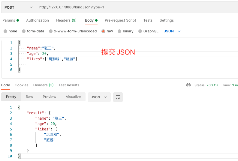 使用函数BindJSON 和 ShouldBindJSON来绑定提交的JSON参数信息。