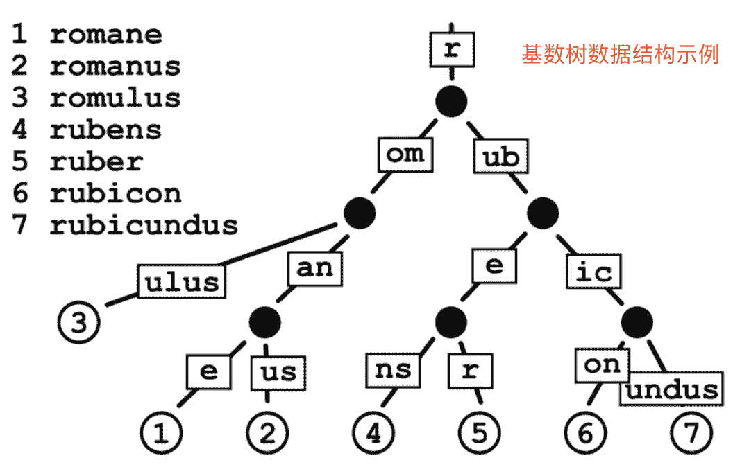 Radix Tree)又称为PAT位树(Patricia Trie or crit bit tree),是一种更节省空间的前缀树(Trie Tree)。对于基数树的每个节点,如果该节点是唯一的子树的话,就和父节点合并。