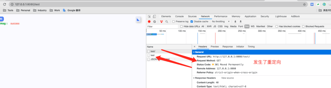 /path时,不会匹配/path/,用命令请求则返回<a href="/test">Moved Permanently</a>,但是用浏览器请求则会正常返回。原因:httprouter默认开启自动重定向,/path/会被重定向到/path,如下图所示: