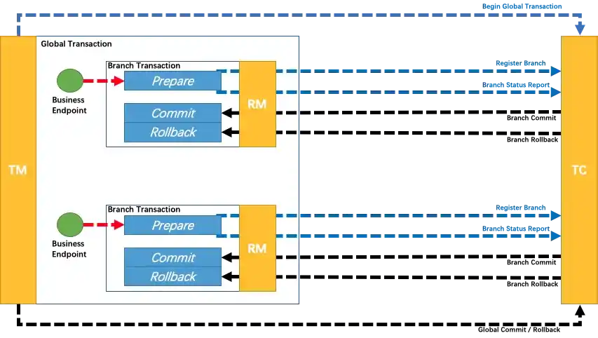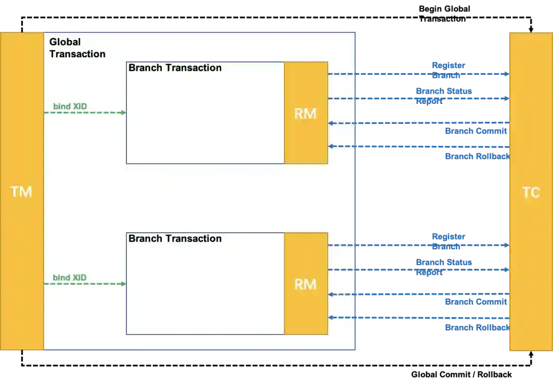 - 分支事务注册:事务发起方将全局事务ID和分支事务ID发送给各个参与者(Participant),即资源管理器。参与者将分支事务ID注册到本地事务管理器,并将事务的执行结果反馈给事务协调器。