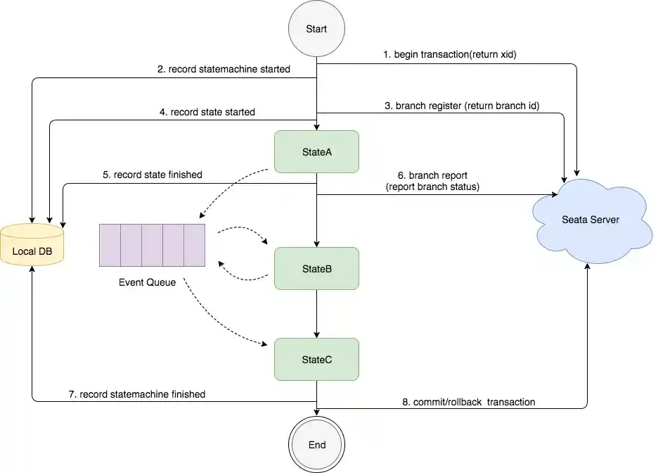 SAGA模式:SAGA模式是一种基于事件驱动的分布式事务模式。在SAGA模式中,每个服务都可以发布和订阅事件,通过事件的传递和处理来实现分布式事务的一致性。Seata提供了与SAGA模式兼容的Saga框架,用于管理和协调分布式事务的各个阶段。