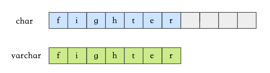 - 如果插入数据的长度小于char的固定长度时,则用空格填充;