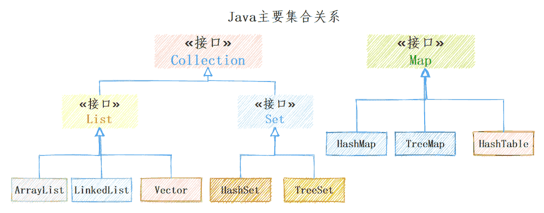 集合相关类和接口都在java.util中,主要分为3种:List(列表)、Map(映射)、Set(集)。