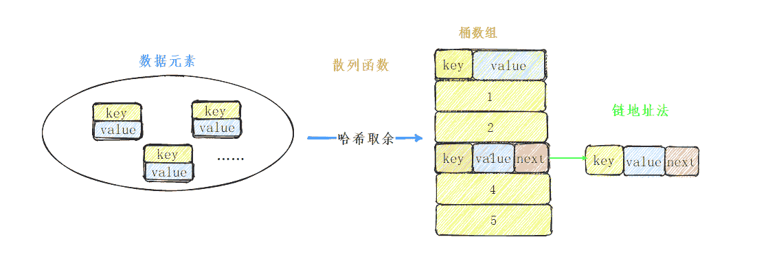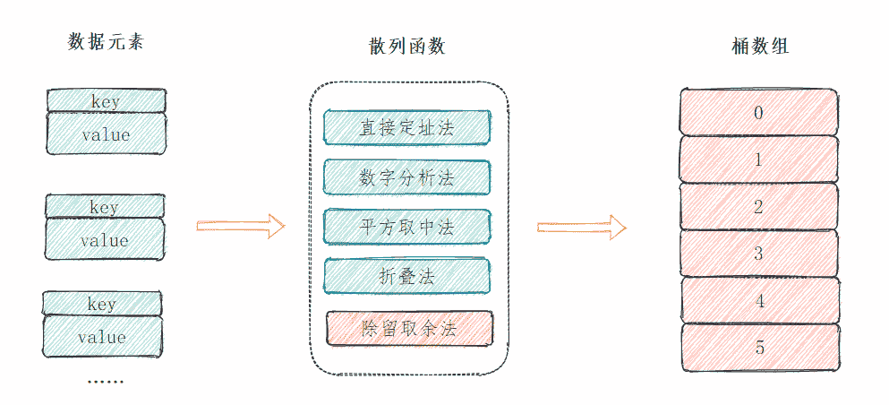 - 数据元素通过映射关系,也就是散列函数,映射到桶数组对应索引的位置