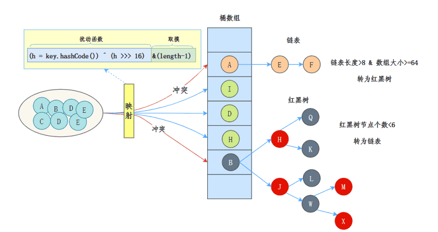 其中,桶数组是用来存储数据元素,链表是用来解决冲突,红黑树是为了提高查询的效率。