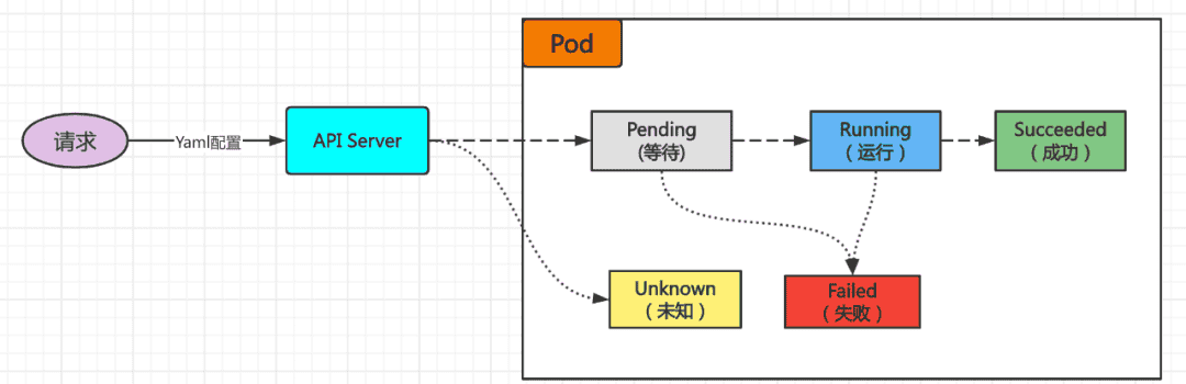 Pending(等待):API Server创建了Pod资源对象并已存入etcd中,但它尚未被调度完成,或者仍处于从仓库下载镜像的过程中。Running(运行):Pod已经被调度至某节点,并且所有容器都已经被kubelet创建完成。Succeeded(成功):Pod中的所有容器都已经成功终止并且不会被重启。Failed(失败): 所有容器都已经终止,但至少有一个容器终止失败,即容器返回了非0值的退出状态或已经被系统终止。Unknown(未知):API Server无法正常获取到Pod对象的状态信息,通常是由于其无法与所在工作节点的kubelet通信所致。