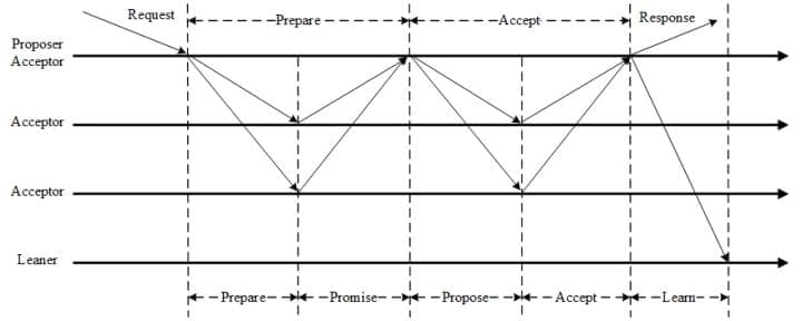 Proposer: 提出提案 (Proposal)。Proposal信息包括提案编号 (Proposal ID) 和提议的值 (Value)。Acceptor: 参与决策,回应Proposers的提案。收到Proposal后可以接受提案,若Proposal获得多数Acceptors的接受,则称该Proposal被批准。Learner: 不参与决策,从Proposers/Acceptors学习最新达成一致的提案(Value)。