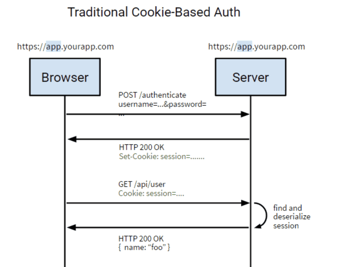 Cookie Based 方案是将Session数据放在Cookie里,访问Web服务器的时候,再由Web服务器生成对应的Session数据,如下图所示。