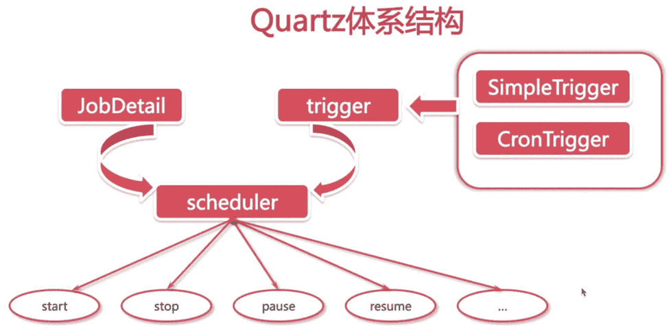 - Scheduler 代表一个调度容器,一个调度容器中可以注册多个 JobDetail 和 Trigger。当 Trigger 与 JobDetail 组合,就可以被 Scheduler 容器调度了。