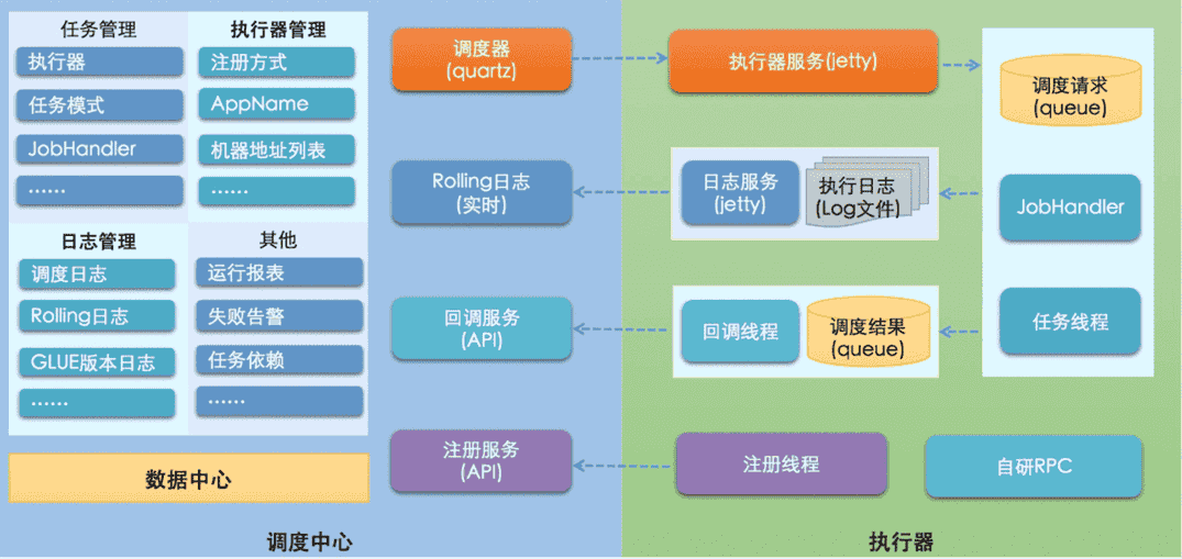 个轻量级分布式任务调度框架 ,主要分为 调度中心和执行器两部分 , 调度中心在启动初始化的时候,会默认生成执行器的RPC代理