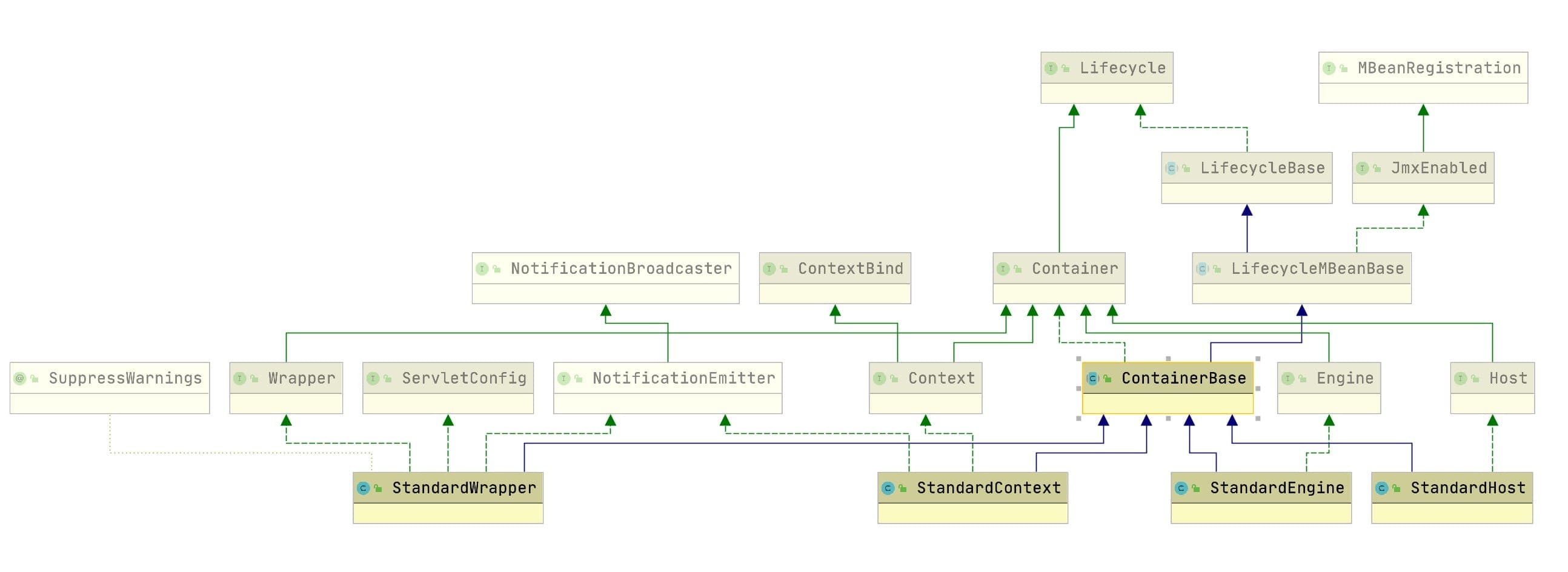 - Container: 表示容器,可以看做Servlet容器;引擎(Engine)、主机(Host)、上下文(Context)和Wraper均继承自Container接口,所以它们都是容器。