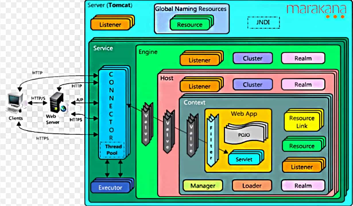 - Server: 表示服务器,它提供了一种优雅的方式来启动和停止整个系统,不必单独启停连接器和容器;它是Tomcat构成的顶级构成元素,所有一切均包含在Server中;