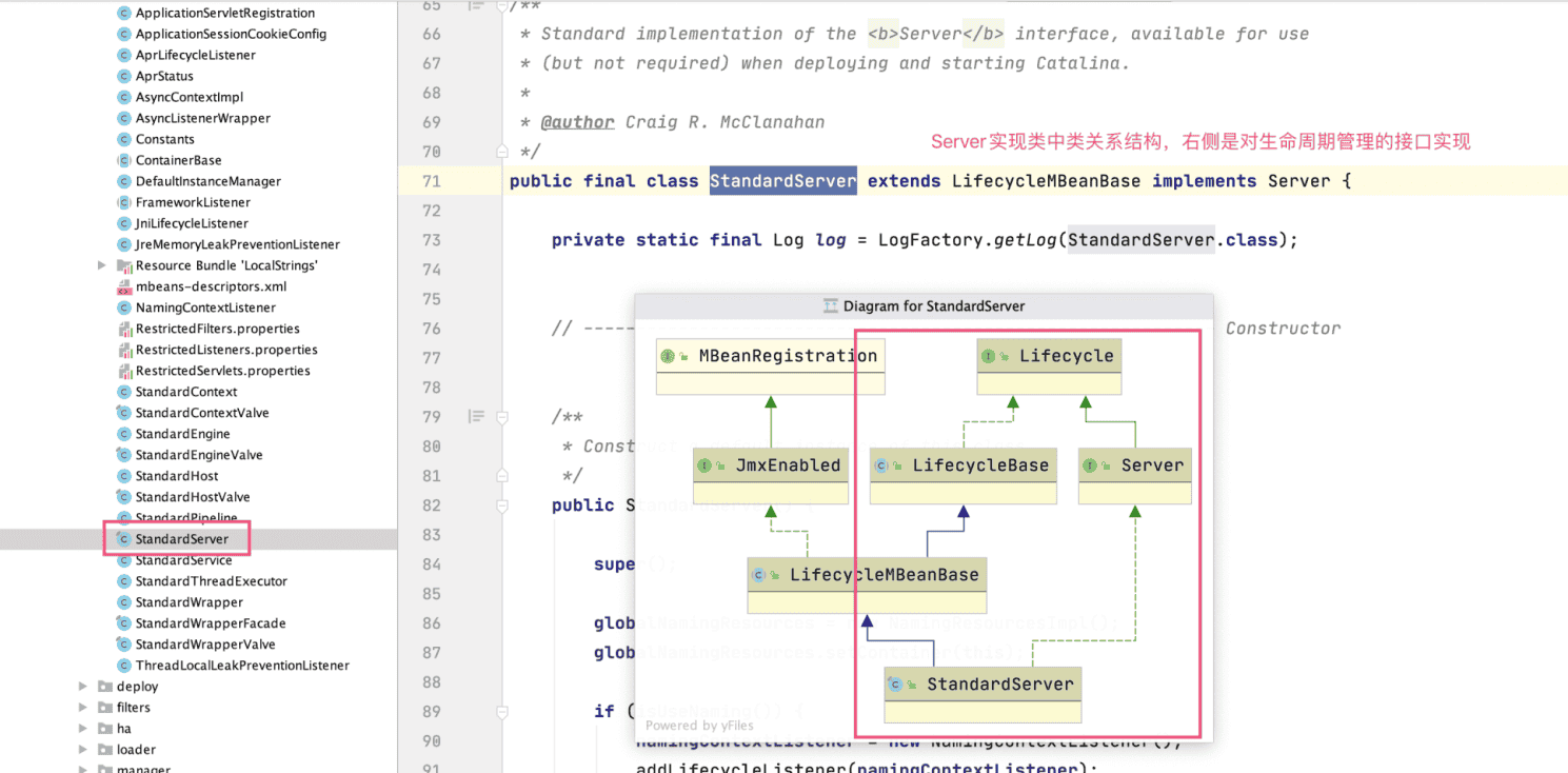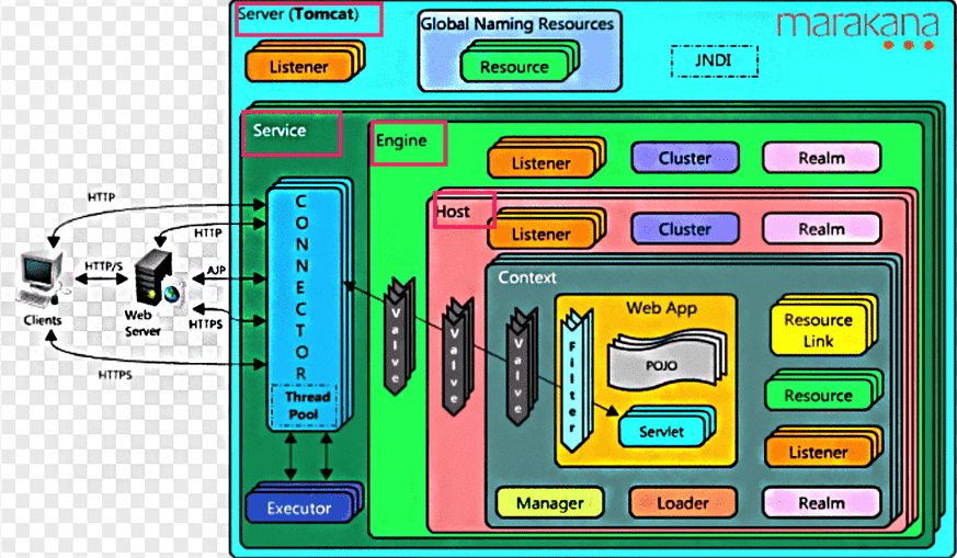 - Service: 表示服务,Server可以运行多个服务。比如一个Tomcat里面可运行订单服务、支付服务、用户服务等等;Server的实现类StandardServer可以包含一个到多个Services, Service的实现类为StandardService调用了容器(Container)接口,其实是调用了Servlet Engine(引擎),而且StandardService类中也指明了该Service归属的Server;