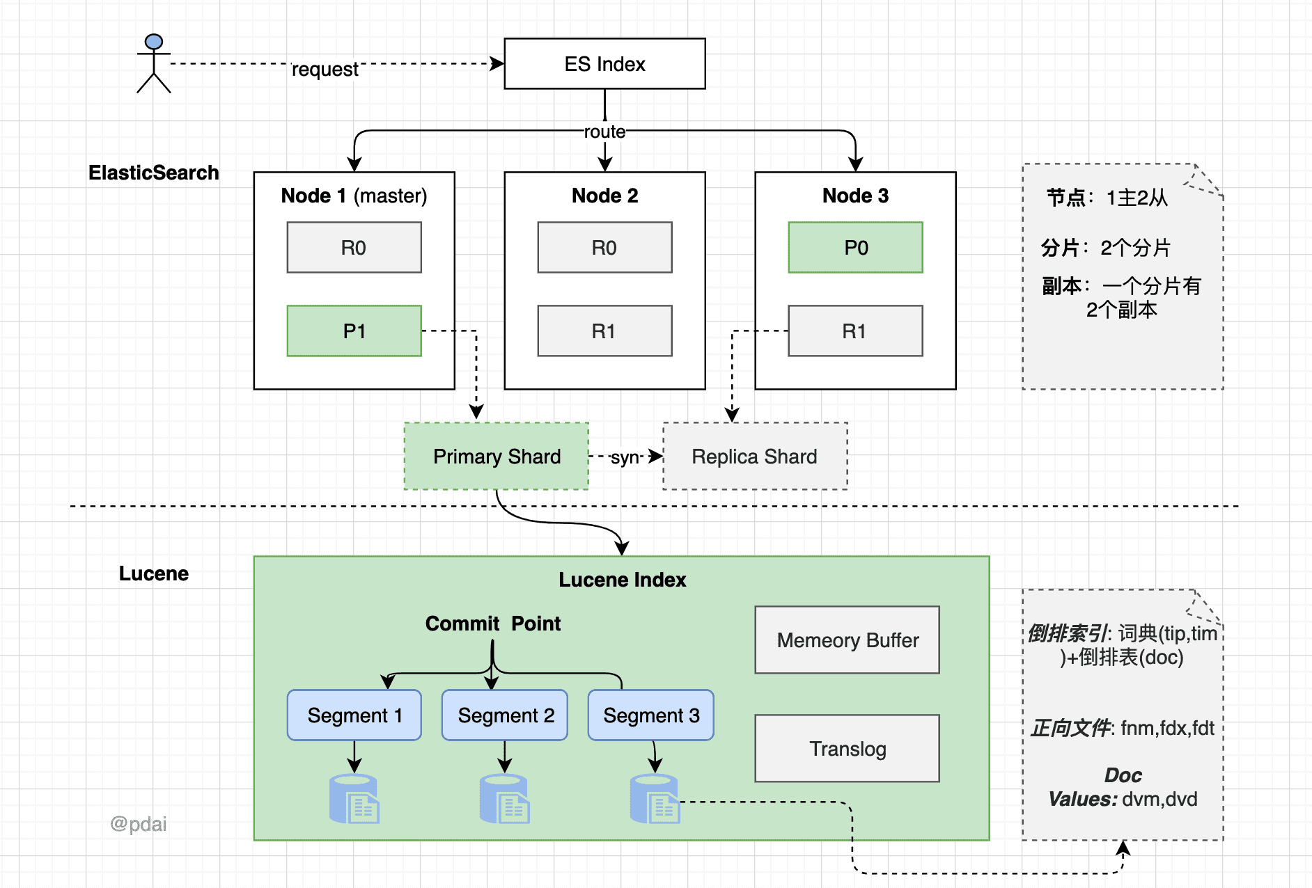 每个节点上会有多个 shard (分片), P1 P2 是主分片, R1 R2 是副本分片