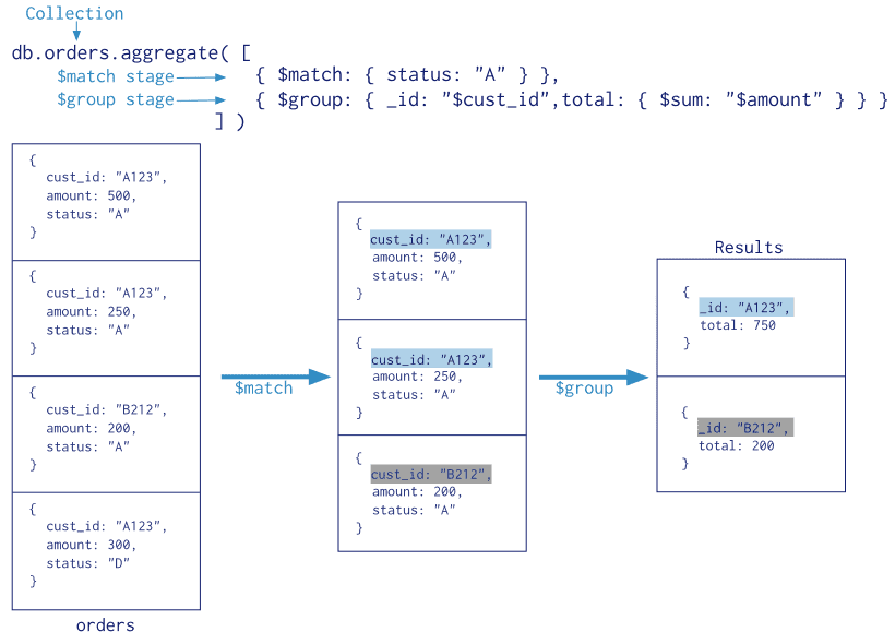 Aggregation Pipline: 类似于将SQL中的group by + order by + left join ... 等操作管道化。MongoDB的聚合管道(Pipline)将MongoDB文档在一个阶段(Stage)处理完毕后将结果传递给下一个阶段(Stage)处理。阶段(Stage)操作是可以重复的。