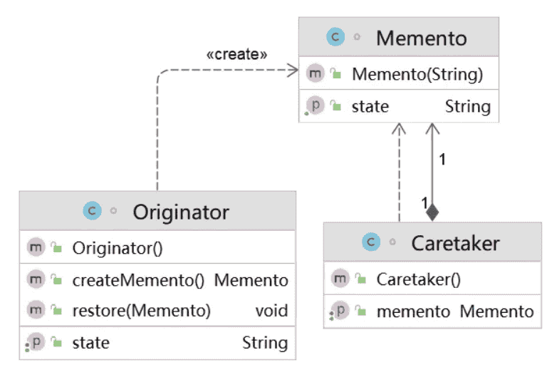 // createMemento()方法创建备忘录对象,并将当前状态保存到备忘录对象中。