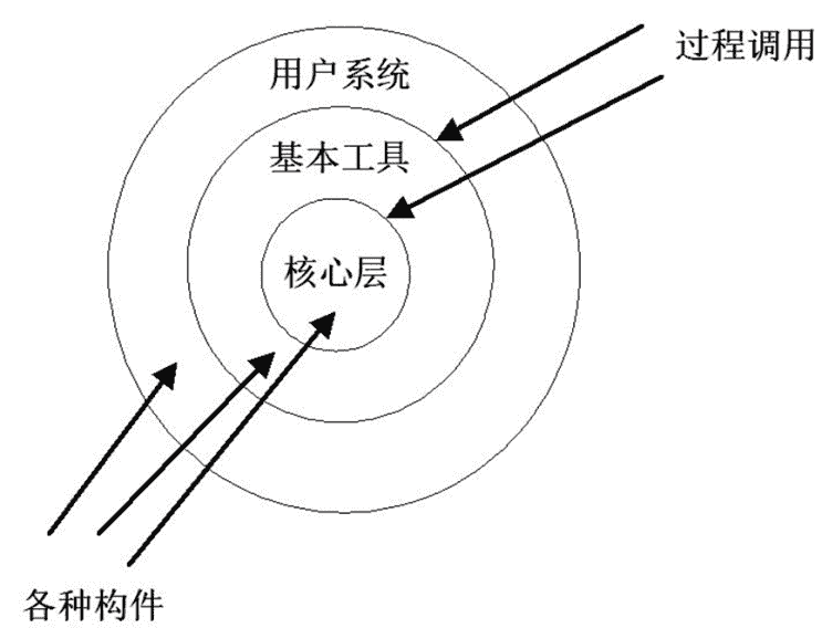 • 操作系统内核和用户态管理:操作系统从核心的内核层,到外围的工具、用户系统,类似一个洋葱模型,层层包裹,所有的过程调用只在相邻两层之间进行。 如下图所示: