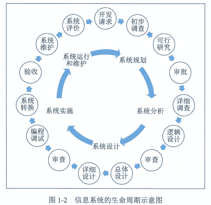 软件在信息系统中属于较复杂的部件,可以借用软件的生命周期来表示信息系统的生命周期。软件的生命周期通常包括:可行性分析与项目开发计划、需求分析、概要设计、详细设计、编码、测试、维护等阶段。