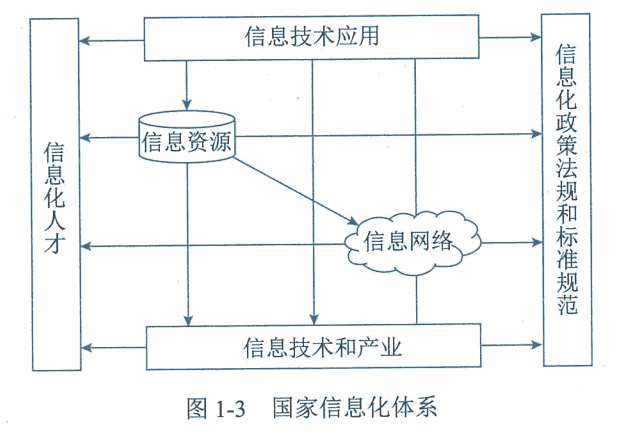 1997年召开的首届全国信息化工作会议,对信息化和国家信息化定义为:"信息化是指培育、发展以智能化工具为代表的新的生产力并使之造福于社会的历史过程。国家信息化就是在国家统一规划和组织下,在农业、工业、科学技术、国防及社会生活各个方面应用信息技术,深入开发并广泛利用信息资源,加速实现国家现代化进程。"国家信息化体系包括信息技术应用、信息资源、信息网络、信息技术和产业、信息化人才、信息化政策法规和标准规范6个要素,这6个要素的关系构成了一个有机的整体,如图所示。