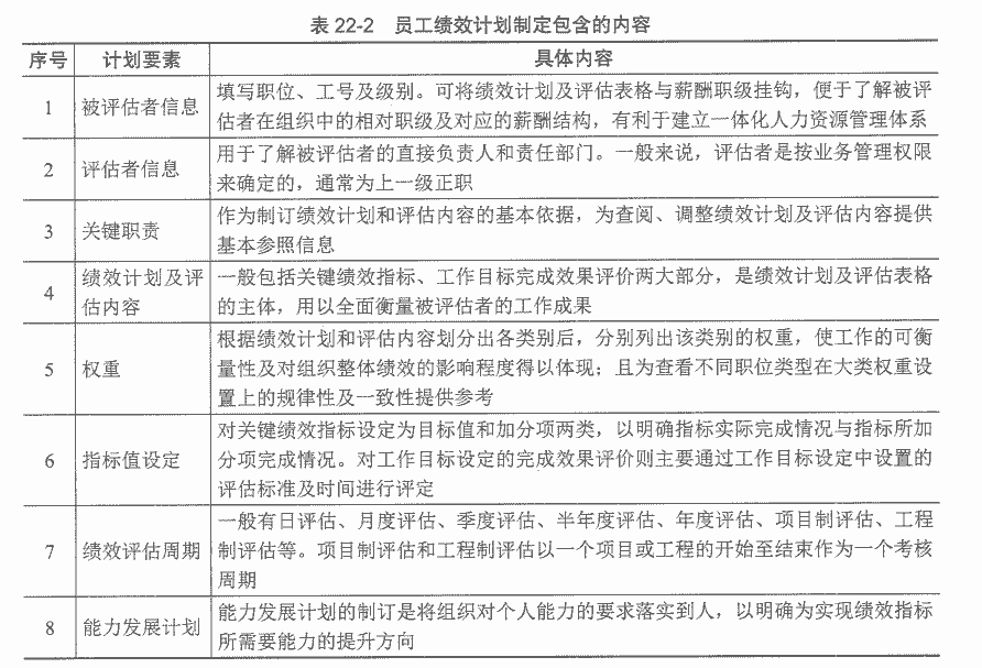 员工绩效计划的制订是通过评估者和被评估者(直接上级和各级员工)双方在充分沟通的情况下,确定相应的绩效标准、绩效目标和绩效内容,并以过去的绩效表现及组织目标为参照,设定每个关键绩效指标的目标指标及挑战指标,以此作为被评估者在绩效考核时的奖惩基础。同时,绩效计划还帮助员工设定一定的能力发展计划,以保证员工绩效目标的实现。