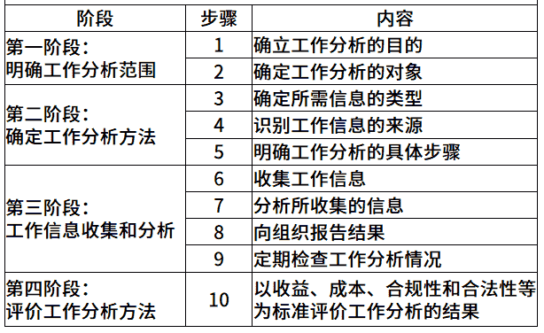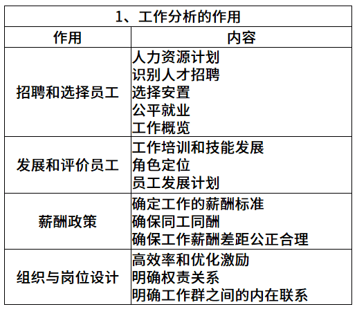 工作分析的目的是明确所要完成的任务以及完成这些任务所需要的人员能力特征。工作分析将每项工作所包含的任务、责任和任职资格用正式的文件明确下来,确保组织中的每项工作都按照管理人员的意愿进行分配。