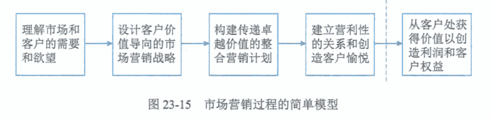 图中的简单模型展示了市场营销过程包含的5个步骤。在前4个步骤中,组织努力理解客户,创造客户价值,并建立稳固的客户关系。在最后一步,组织因创造卓越的客户价值而得到回报。正是通过为客户创造价值,组织从客户身上得到以销售额、利润和长期客户权益为形式的价值回报。