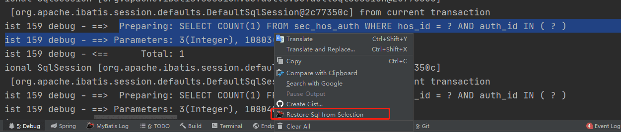 Preparing到Parameters这两行的参数选中,右键选择restore sql from Selection