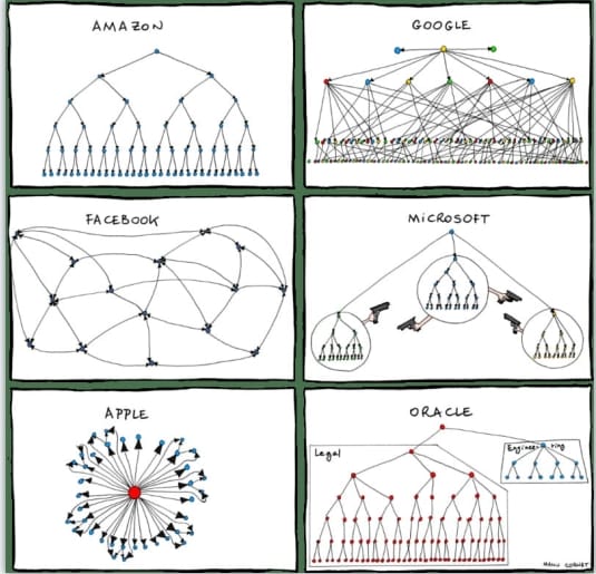 前面说了,人是复杂的社会动物,人与人的通过非常复杂。但是当我们面对复杂系统时,又往往只能通过增加人力来解决。这时,我们的组织一般是如何解决这个沟通问题的呢?Divide and conquer,分而治之。大家看看自己的公司的组织,是不是一个一线经理一般都是管理15个人以下的?二线经理再管理更少的一线?三线再管理更少的,以此类推。(这里完全没有暗示开发经理比程序猿更难管理)