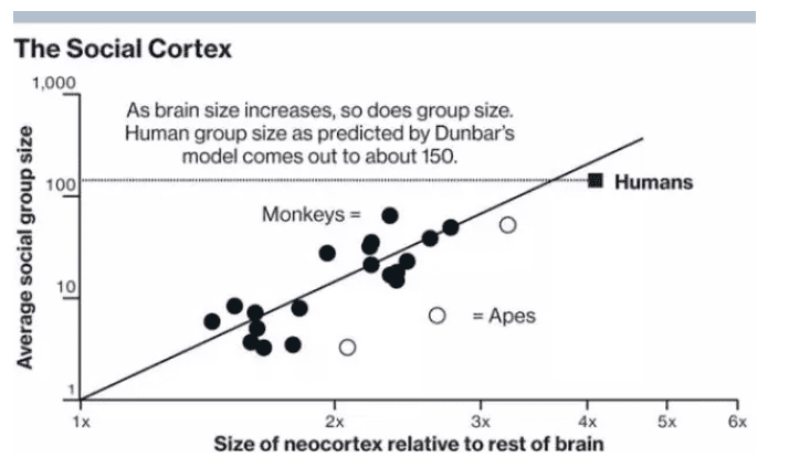 Mike还举了一个非常有意思的理论,叫“Dunbar Number”,这是一个叫Dunbar(废话)生物学家在1992年最早提出来的。最初,他发现灵长类的大脑容量和其对应的族群大小有一定关联,进而推断出人类的大脑能维系的关系的一些有趣估计。举例来说