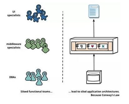 这是第一定律组织和设计间内在关系的一个具体应用。更直白的说,你想要什么样的系统,就搭建什么样的团队。如果你的团队分成前端团队,java后台开发团队,DBA团队,运维团队,你的系统就会长成下面的样子: