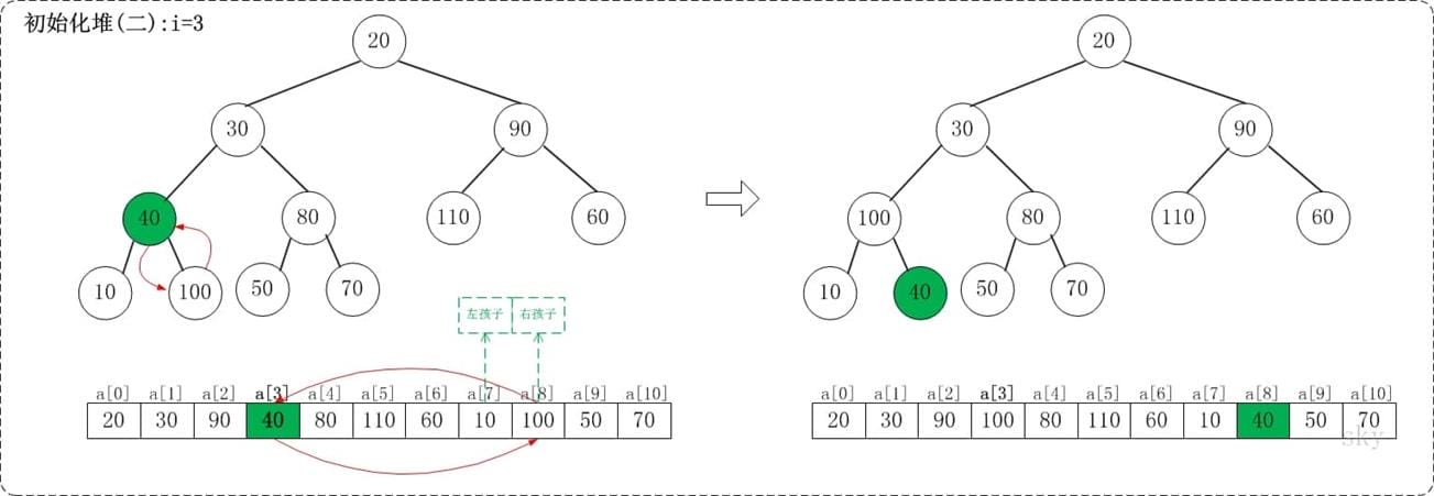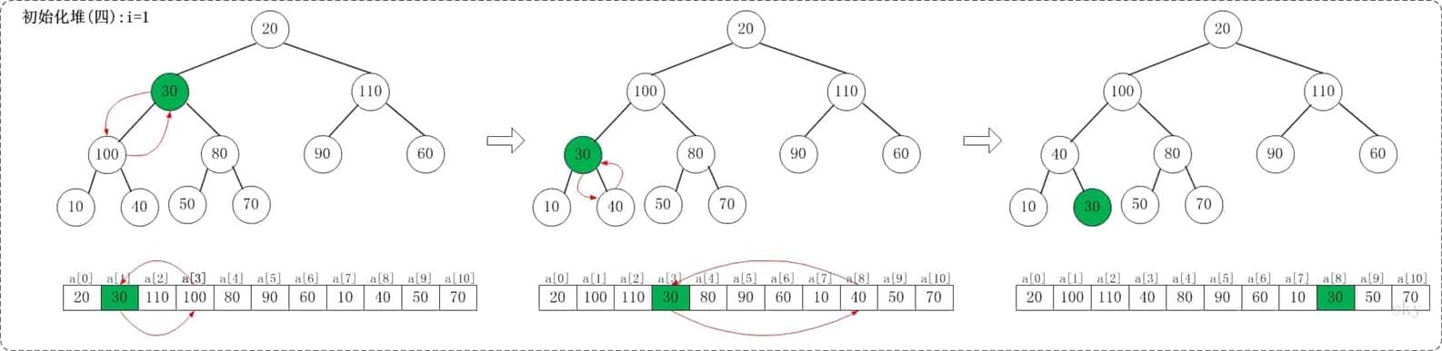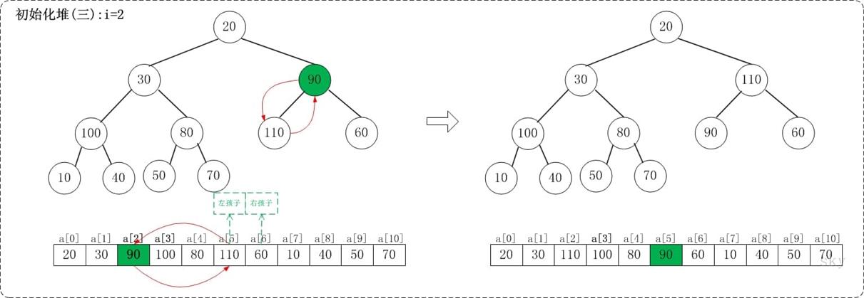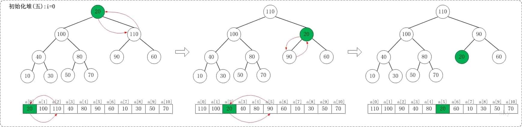 下面演示heap_sort_asc(a, n)对a={20,30,90,40,70,110,60,10,100,50,80}, n=11进行堆排序过程。下面是数组a对应的初始化结构: