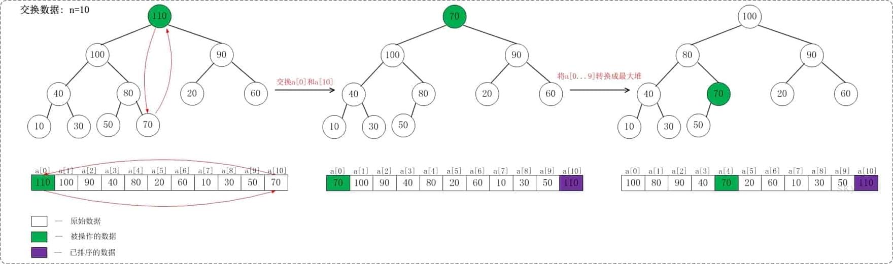 最大堆进行升序排序的基本思想: ① 初始化堆: 将数列a[1...n]构造成最大堆。 ② 交换数据: 将a[1]和a[n]交换,使a[n]是a[1...n]中的最大值;然后将a[1...n-1]重新调整为最大堆。 接着,将a[1]和a[n-1]交换,使a[n-1]是a[1...n-1]中的最大值;然后将a[1...n-2]重新调整为最大值。 依次类推,直到整个数列都是有序的。