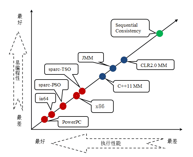 上面表格中的各种处理器内存模型,从上到下,模型由强变弱。越是追求性能的处理器,内存模型设计的会越弱。因为这些处理器希望内存模型对它们的束缚越少越好,这样它们就可以做尽可能多的优化来提高性能。