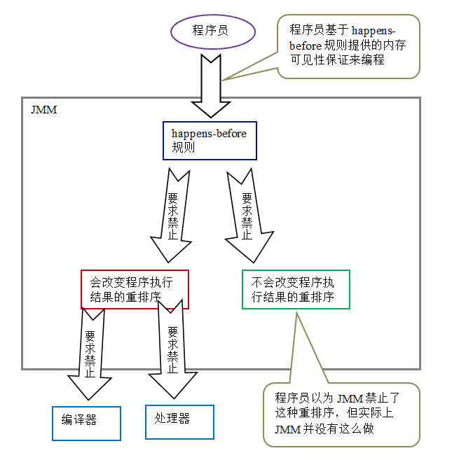 由于 A happens- before B,happens- before 的定义会要求:A 操作执行的结果要对 B 可见,且 A 操作的执行顺序排在 B 操作之前。 但是从程序语义的角度来说,对 A 和 B 做重排序即不会改变程序的执行结果,也还能提高程序的执行性能(允许这种重排序减少了对编译器和处理器优化的束缚)。也就是说,上面这 3 个 happens- before 关系中,虽然 2 和 3 是必需要的,但 1 是不必要的。因此,JMM 把 happens- before 要求禁止的重排序分为了下面两类: