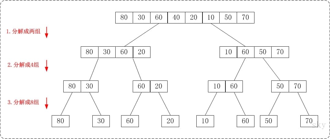 从上往下的归并排序采用了递归的方式实现。它的原理非常简单,如下图: