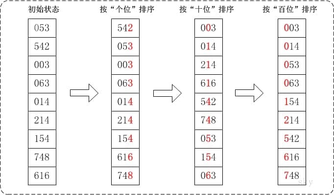 通过基数排序对数组{53, 3, 542, 748, 14, 214, 154, 63, 616},它的示意图如下: