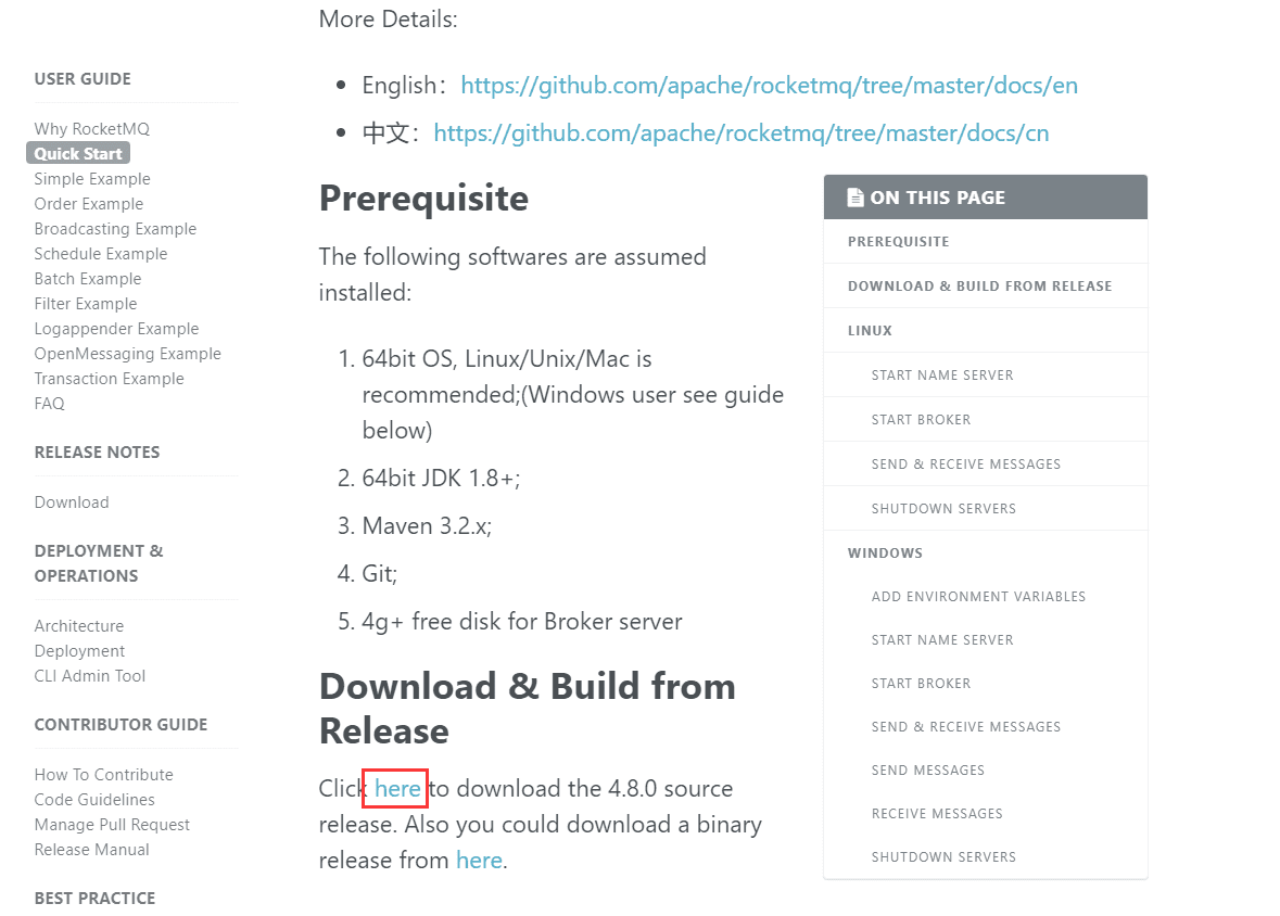 进入官网,点击进行下载,Quick Start - Apache RocketMQ (opens new window)