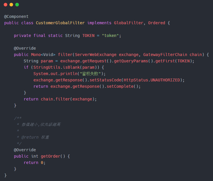 全局过滤器作用于所有路由,无需配置。通过全局过滤器可以实现对权限的统一校验,安全性验证等功能