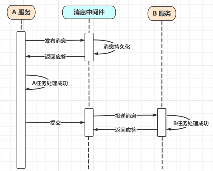 - 在服务A处理任务A前,首先向消息中间件发送一条半信息