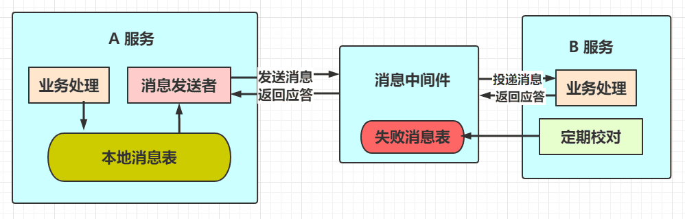 消息事务的原理是 将两个事务通过消息中间件来进行异步解耦。基于可靠消息服务的方案是通过消息中间件来保证上、下游应用数据操作的一致性。假设有 A、B两个服务,分布可以处理 A、B两个任务,此时需要存在一个业务流程,将任务 A和B 放到同一个事物中处理,这种方式就可以借助消息中间件来实现。