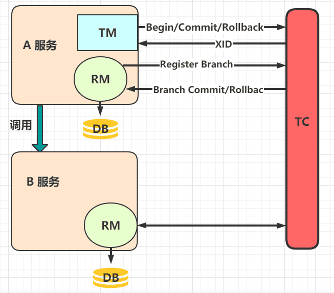 - 服务A开始远程调用B服务,此时 XID 会根据调用链传播