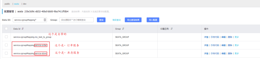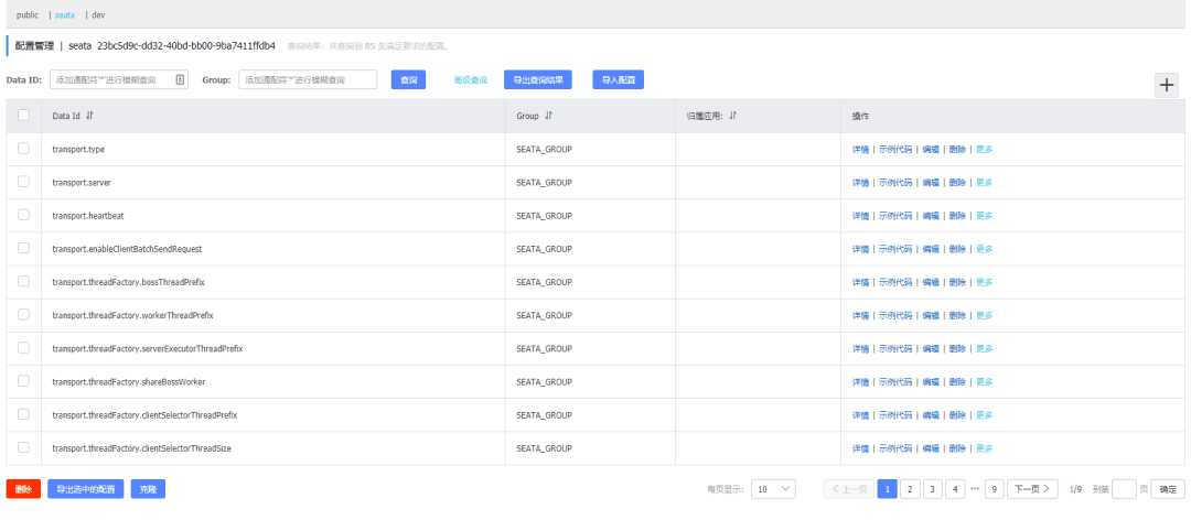 sh nacos-config.sh -h localhost -p 8848 -g SEATA_GROUP -t namespace-id(需要替换) -u nacos -w nacos1操作结束后,我们便可以在 nacos 控制台中看到配置列表,日后配置有需要修改便可以直接从这边修改,而不用修改目录文件: